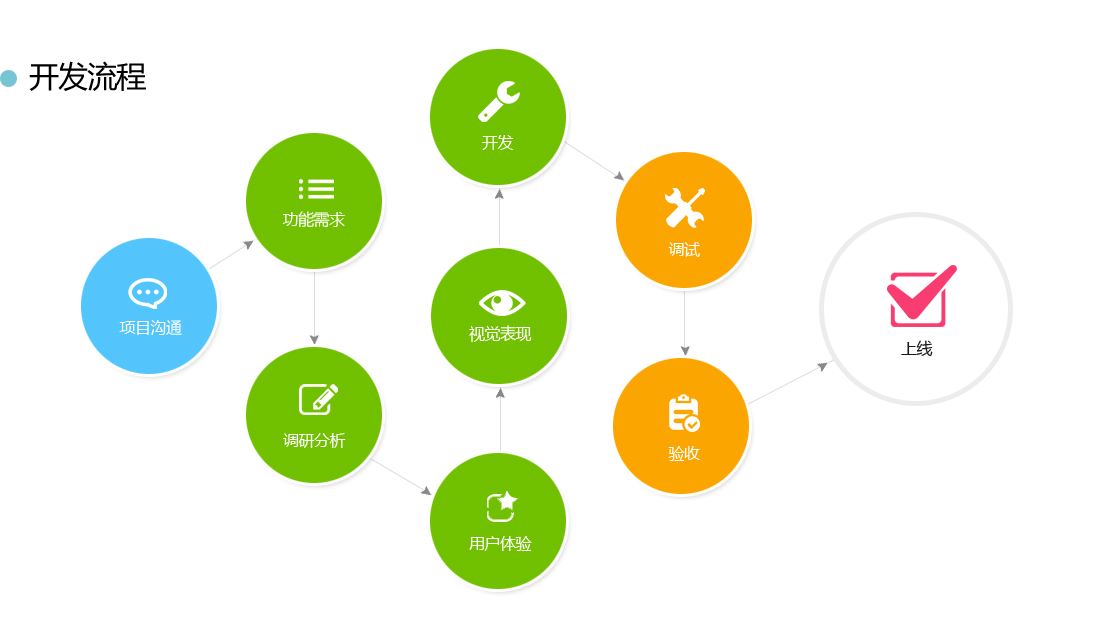 2.研發階段:接下來就是項目的正式開發階段,首先進行整體的架構開發,然后前端人員進行前端的頁面與特效開發,后端人員進行業務邏輯處理與數據持久化處理。中間可能會有一些第三方軟件進行對接,比方說微信登錄,qq登錄,微信支付,支付寶支付,等等。最后需要測試人員進行項目的測試,然后再去進行修改。一切準備完畢后,就會將項目教給客戶進行實際的部署與安裝。然后客戶可能會根據自己的測試體驗提出一些建議與意見。