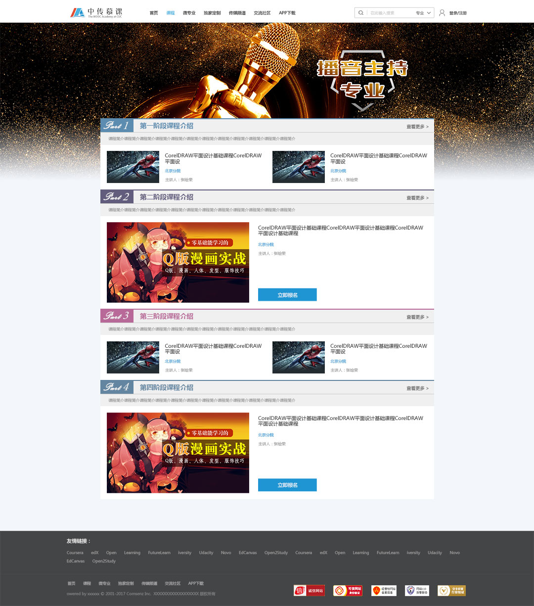 中傳慕課學堂是中國傳媒大學在線非學歷育培訓的總平臺,承擔中國傳媒大學慕課開發與建設、在線非學歷教育培訓工作。致力于打造信息傳播領域前沿在線課程,為所有需要信息傳播知識的學習者提供線上學習資源和先進解決方案。