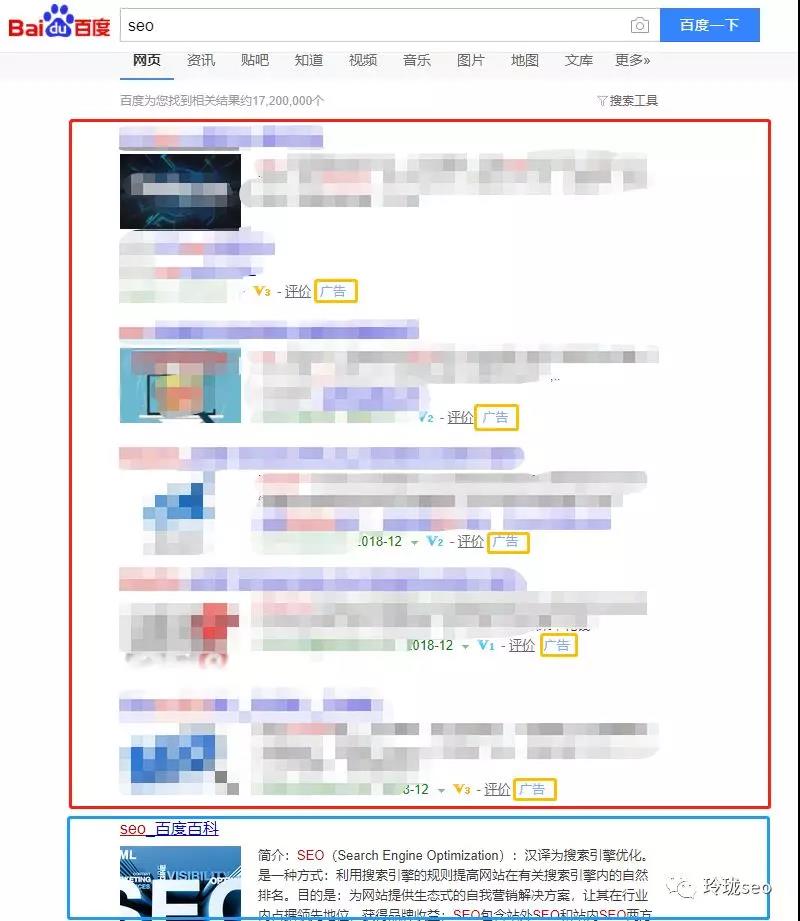 為了避免打廣告嫌疑,敏感信息打了馬賽克??梢钥吹郊t框中都是sem的展示結(jié)果,每一條記錄分別都被打上了“廣告”的字樣,也就是說他們都是參與搜索引擎官方付費(fèi)推廣的,你點(diǎn)擊一次他們的網(wǎng)站,他們就要花掉一筆推廣費(fèi)用。這也是人民幣玩家的游戲。而籃框中的seo百度百科結(jié)果便是seo優(yōu)化做上來的第一名。舉個(gè)這樣的例子大家能更好的理解seo和sem的區(qū)別了嗎?
